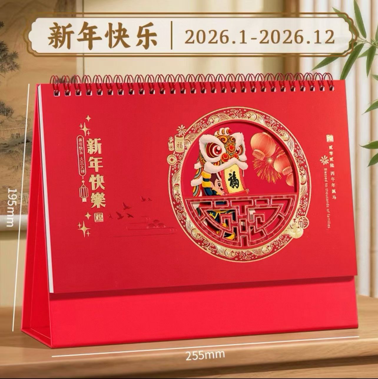 这是一款2026年的中国风台历,设计上融合了传统元素与现代审美。台历整体采用红色为主色调,象征着喜庆与吉祥。封面中央有一个圆形图案,内含舞狮形象,周围环绕着精美的花纹和“福”字,寓意着新年快乐和好运连连。